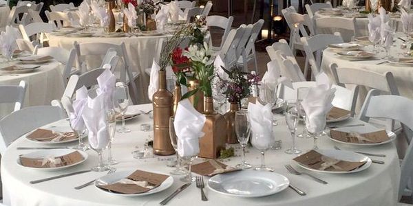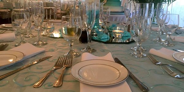 Includes: Tables, table clothes, chairs, cloth napkins, dinner plates, dessert plates, forks, knifes, dessert spoons, two cups, (for water and wine or champagne), salt pepper, and one extra hour of service and rental.